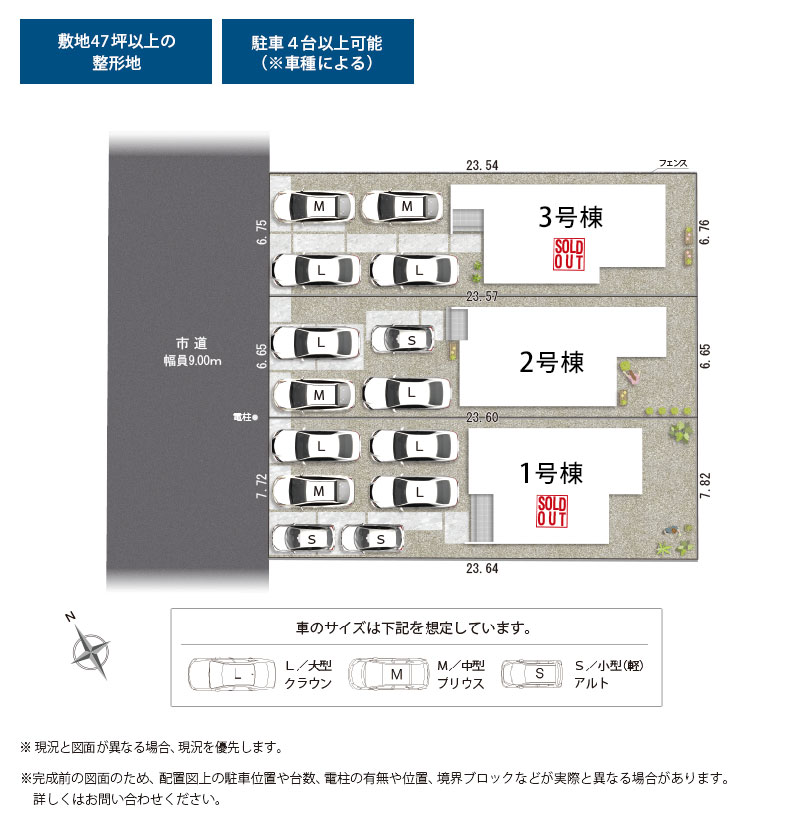 敷地47坪以上の整形地、駐車4台以上可能(※車種による)