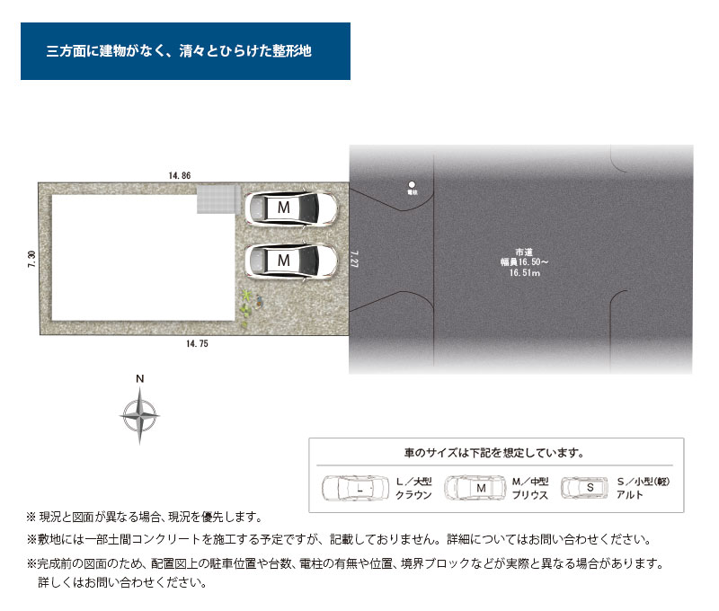 三方面に建物がなくひらけた、清々とした整形地。