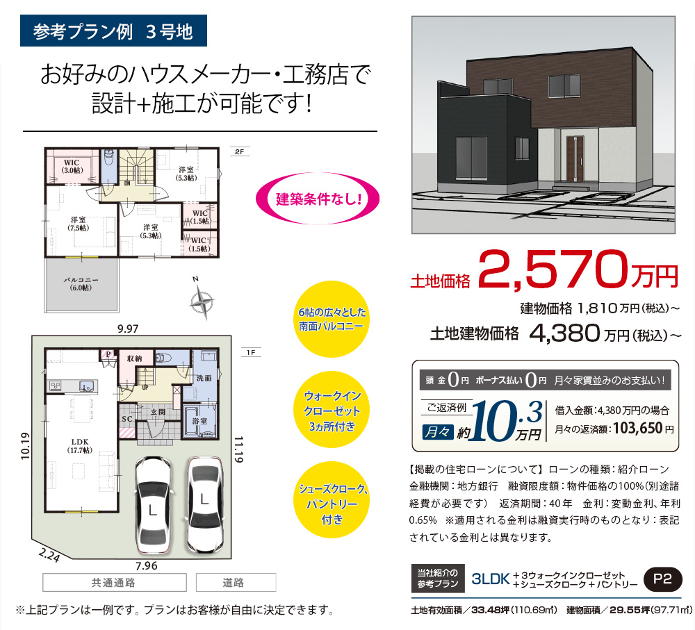 1号地: ご成約済み 2号地: ご成約済み 3号地: 2,570万円 4号地: ご成約済み 5号地: ご成約済み 6号地: ご成約済み 7号地: ご成約済み |