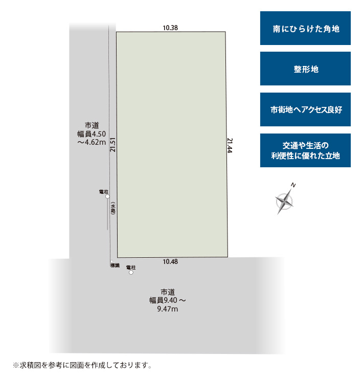 | 接道状況 | 南西側4.50~4.62mの市道と南東側9.40~9.47mの市道に接する |