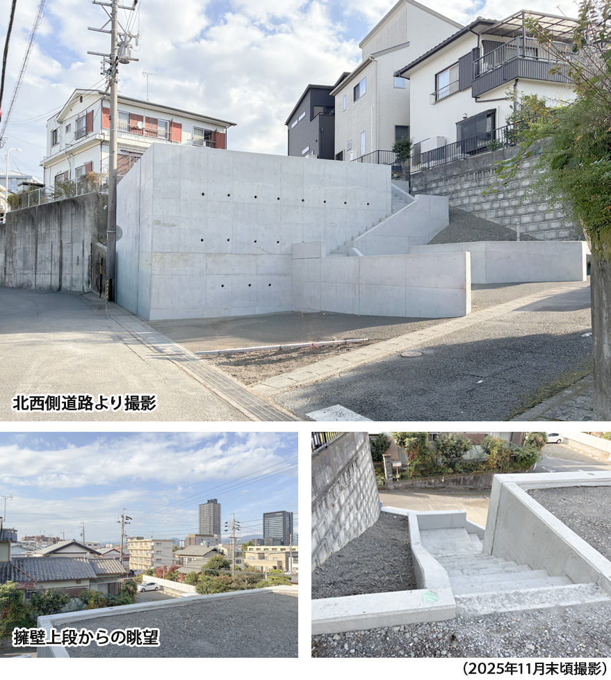 | 代表的な擁壁の構造※ | L型擁壁(H5.85):RC(鉄筋コンクリート)造 設計表面載荷重:35KN/㎡ ------- この擁壁は表面載荷重35KN/㎡を考慮して設計されており、地盤調査により十分な支持力も確認済みです。必要に応じて建物には鋼管杭などの地盤改良も可能で、適切な基礎計画と組み合わせれば、木造に限らず多様な建物設計が可能な造成となっています。詳細な資料はご請求ください。 ※その他擁壁は別途構造計算書による |