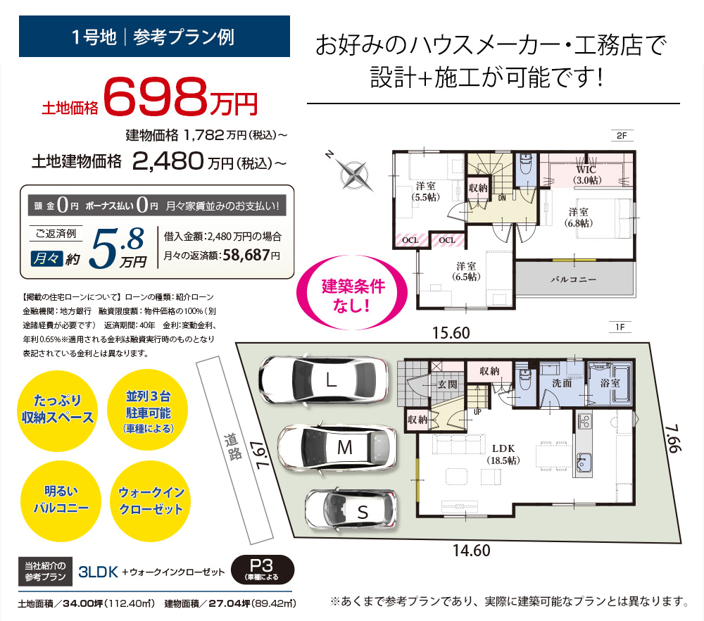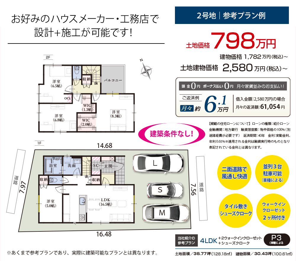 1号地: 698万円 2号地: 798万円 |