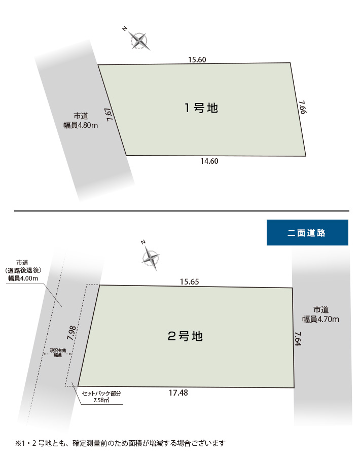 [1号棟]北西側4.80mの市道に接する [2号棟]南東側4.70mと北西側(道路後退後)4.00mの市道に接する ※道路後退前幅員2.10m |