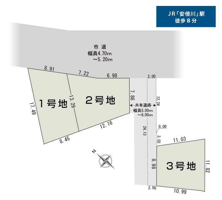 1号地:土地面積/128.88㎡(38.98坪) 2号地:土地面積/132.23㎡(39.99坪) 3号地:土地有効面積/112.66㎡(34.07坪) ※共有通路部分を含めた総面積/161.79㎡(48.49坪) |