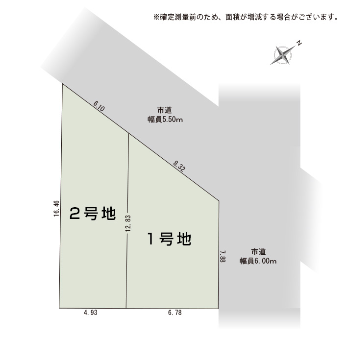 1号地:北西側5.50mの市道と東側6.00mの市道に接する 2号地:北西側5.50mの市道に接する |