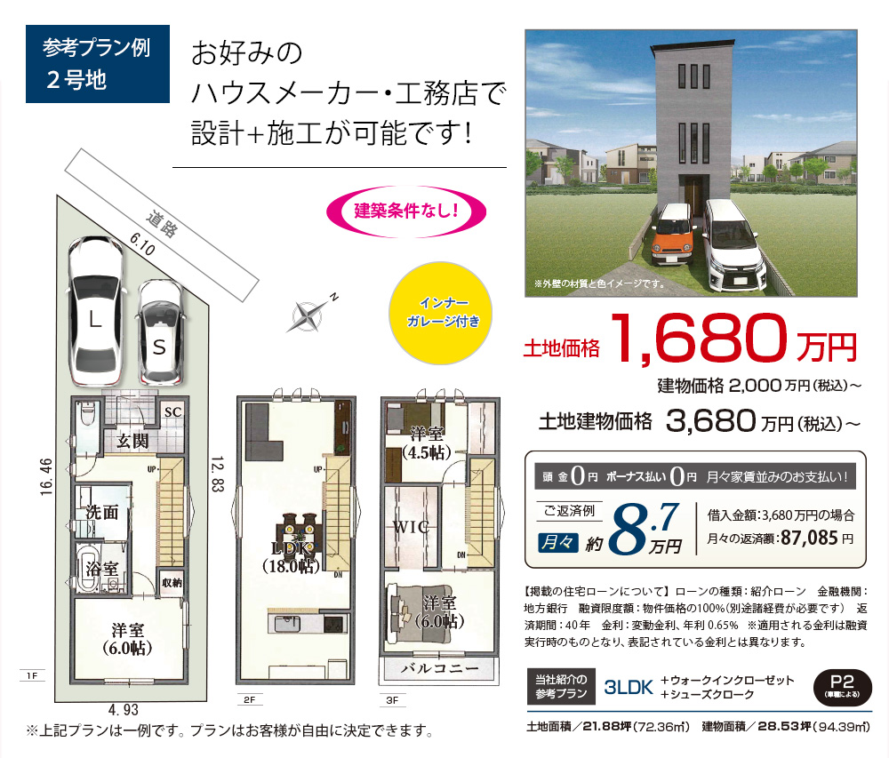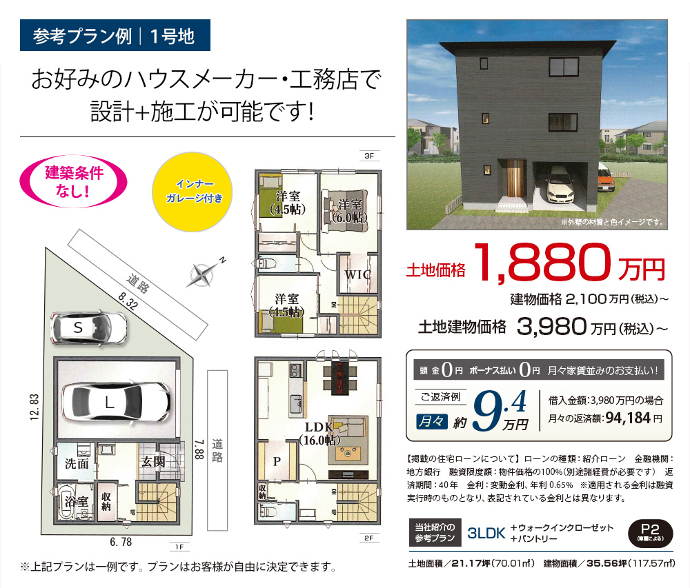 1号地:面積/70.01㎡(21.17坪) 2号地:面積/72.36㎡(21.88坪) |