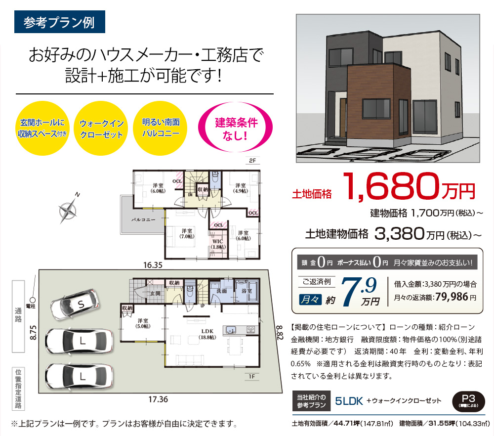 1号地: 2,180万円 2号地: 1,998万円 3号地: 1,864万円 4号地: ご成約済み 5号地: 1,680万円 |