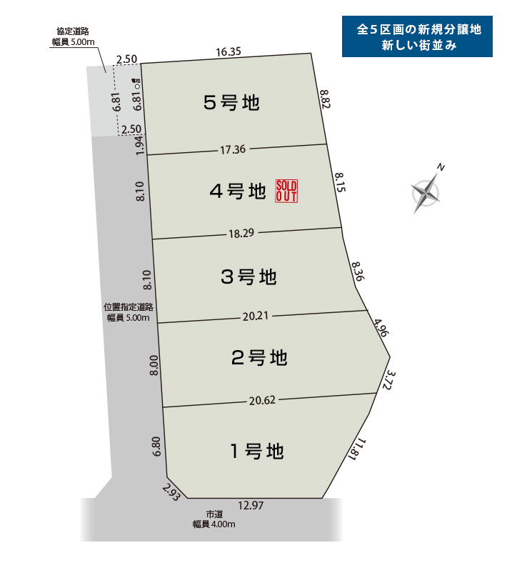 | 接道状況 | 1号地:南西側5.00mの位置指定道路と南東側4.00mの市道に接する 2~5号地:南西側5.00mの位置指定道路に接する |
