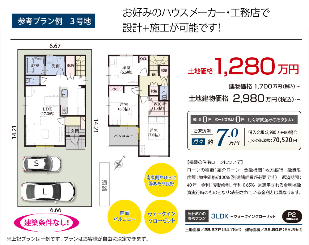 1号地:1,680万円 2号地:1,480万円 3号地:1,280万円 |