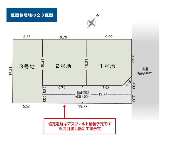 1号地:土地面積/100.14㎡(30.29坪) 2号地:土地有効面積/100.54㎡(30.41坪) 協定道路部分含めた総面積/139.82㎡(42.29坪)3号地:土地有効面積/94.78㎡(28.67坪) 協定道路部分含めた総面積/134.06㎡(40.55坪) |